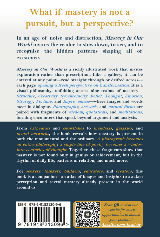 Mastery in Our World is a richly illustrated work that invites exploration rather than prescription. Like a gallery, it can be entered at any point—read straight through or drifted across—each page opening a fresh perspective on transformation. It is a visual philosophy, unfolding across nine realms of mastery—Structure, Creativity, Synchronicity, Belief, Thought, Emotion, Strategy, Fortune, and Improvement—where images and words meet in dialogue. Photography, artwork, and natural forms are paired with fragments of wisdom, quotations, and meditations, forming encounters that speak beyond argument and analysis.